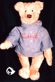 American Bear Collection This guy is made of off white, English sparse mohair, 17 inches tall, shoe button eyes, wool felt paw pads, excelsior/cotton stuffing. He is wearing a replicated hand embroidered "Teddy B" shirt, made by the artist. Stuffed with excelsior/cotton. Reference #ABC018 $169.00 US plus S&H. |