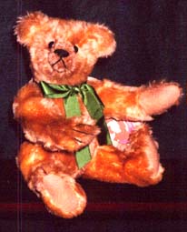 Edgar A one-of-a-kind is made of antiqued dense mohair, 12 inches tall, shoe button eyes, wool felt paw pads, excelsior/cotton stuffing. He wears a green ribbon. He features a center seam from nose to back of the neck. Reference Edgar $139.00 US plus S&H. |