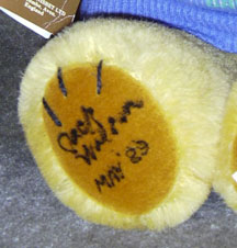 This darling 16 inch, golden mohair teddy bear is hard to find in the States, and sought after in England. He is wearing Peter Bull's Signiature Sweater. He is signed by Jack Wilson, 1989.