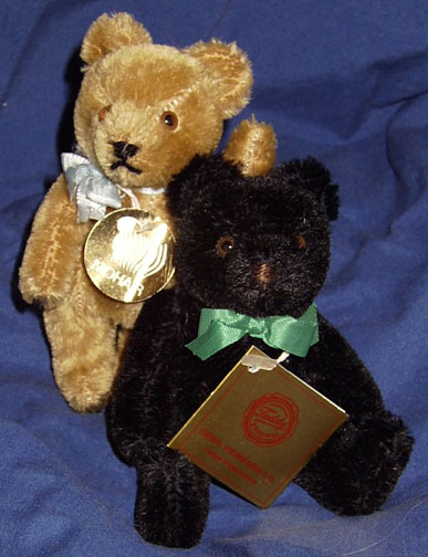 Pair of Hermann Teddy Originals Tan, 5 inch, Fully Jointed, Glass eyes, Sewn mouth and nose, mohair chest tag, Light blue ribbon. Fabric arm tag, Excellent condition. Black, 5 inch, Fully Jointed, Glass eyes, Sewn mouth and nose, Hermann chest tag, 62/14. Green ribbon. Fabric arm tag and “P & E Rubin, Inc.“ tag. Excellent condition.