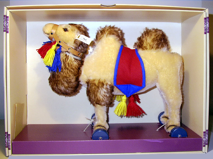1995 Steiff Created by Steiff exclusively for Steiff Club Members, Edition was limited to the number order by members. Only 1,770 pieces were produced. This camel has been produced from old patterns of 1930 in finest mohair and is stuffed with wood shavings. The camel is fitted onto a stable frame with wheels. Wears a porcelain badge. White ear tag. The leather bridle as well as the saddle cloth is especially lavishly produced.