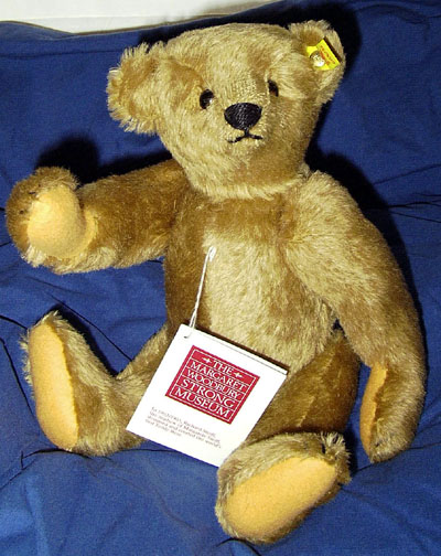 Steiff Margaret Strong Museum Mohair with Button-in-the-Ear, Yellow Ear tag, "The Margaret Woodbury Strong Museum" chest hangtag. Production years: 1982-1990. Glass Eyes 12 inch (32 cm) tall, fully jointed, stitched nose, mouth and claws. EAN 0155/32
