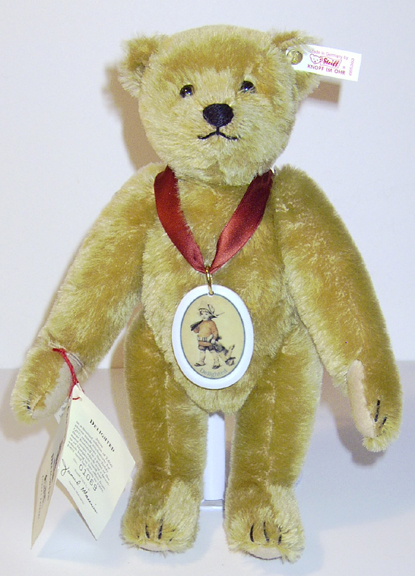 Steiff Limited Edition of 7500, made exclusively for QVC. This bear reproduces the Teddy Bear featured in a print of the same name which was a favorite of Margarete Steiff, which hung in her office from 1907 until her death in 1909. 11.8 inches (30 cm) tall, jointed, mohair, wool felt paw pads, stitched nose and claws. Wears a porcelain pendant with the picture of the print. EAN 665363, Ed. No. 1069.