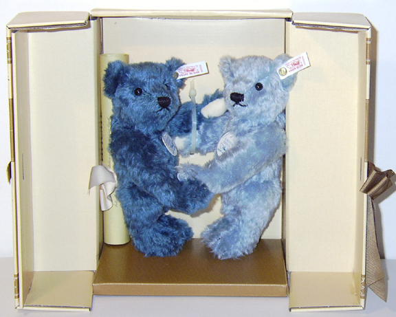 Steiff Limited Edition of 4000, Representative of the enduring bond between a Steiff Teddy Bear and it's owner, "Forever Friends". This happy pair is also an expression of the joyful camaraderie of any two people who have loved and laughed together. They would make a great wedding gift! Two bears, 9.06 inches (23 cm), blue mohair, wool felt, fully jointed, stitched noses and claws. USA exclusive. EAN 665059, Ed. No. 559.