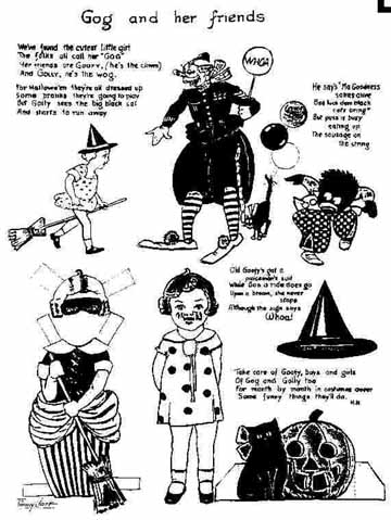 I wonder if any of you ever seen the Golly associated with Halloween before, In the October, 1929 issue of 'The Western Home Monthly', from Canada, I found a paper doll cut-out in a full color page, titled "Gog and her friends". This story and the illustrations were done by a talented gentleman named Jimmy Clark. What an imagination he had! It certainly isn't what we would, today, consider the norm! When one views the poor cat with the balloons tied to his tail, perhaps a few animal lovers will frown at Mr. Clark's humor. In 1929 the language used in the verse was accepted, but today it would be considered rather condescending to African American people. In all the many books, postcards and stories about the Golliwog, I have never before seen the Golly associated with Halloween, and I thought this might be a first for many readers also. My apologies if this story and illustrations have offended any one. It is not intended as such, but is part of Golliwog history, which should not be overlooked. |
